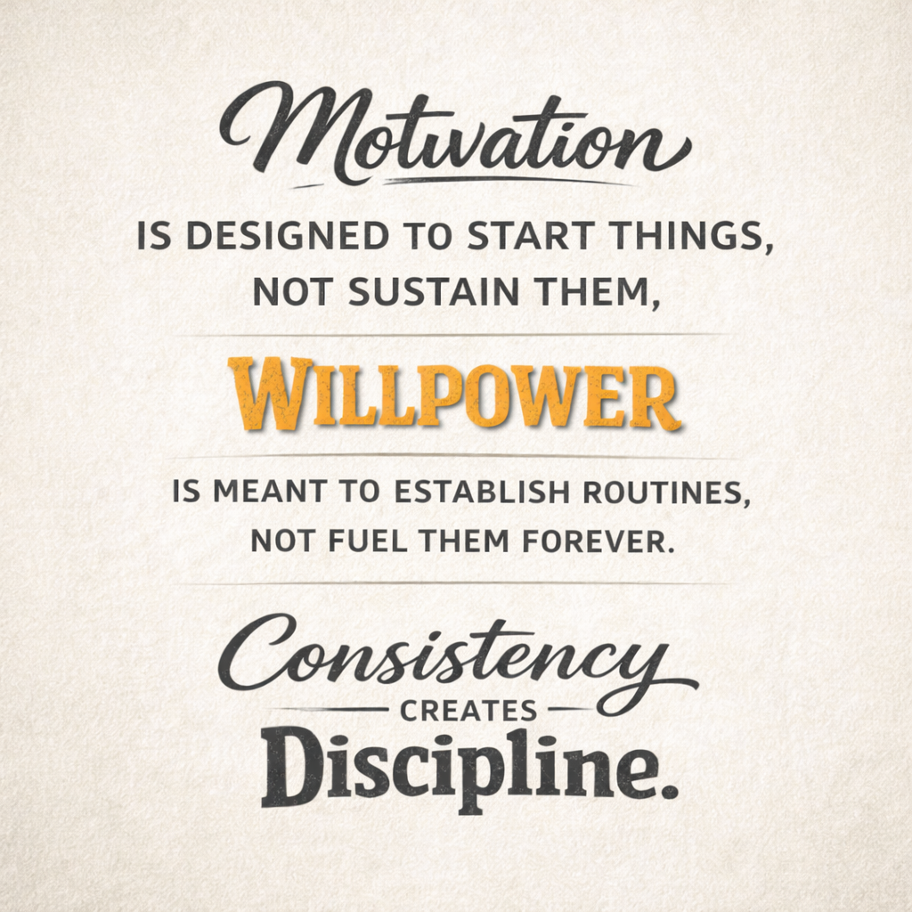 Motivation is designed to start things, not sustain them. Willpower is meant to establish routines, not fuel them forever.